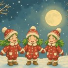 Three figures in red coats and Santa hats stand together in a snowy landscape, surrounded by trees. They have green hair and are set against a dark blue sky with white snowflakes falling.