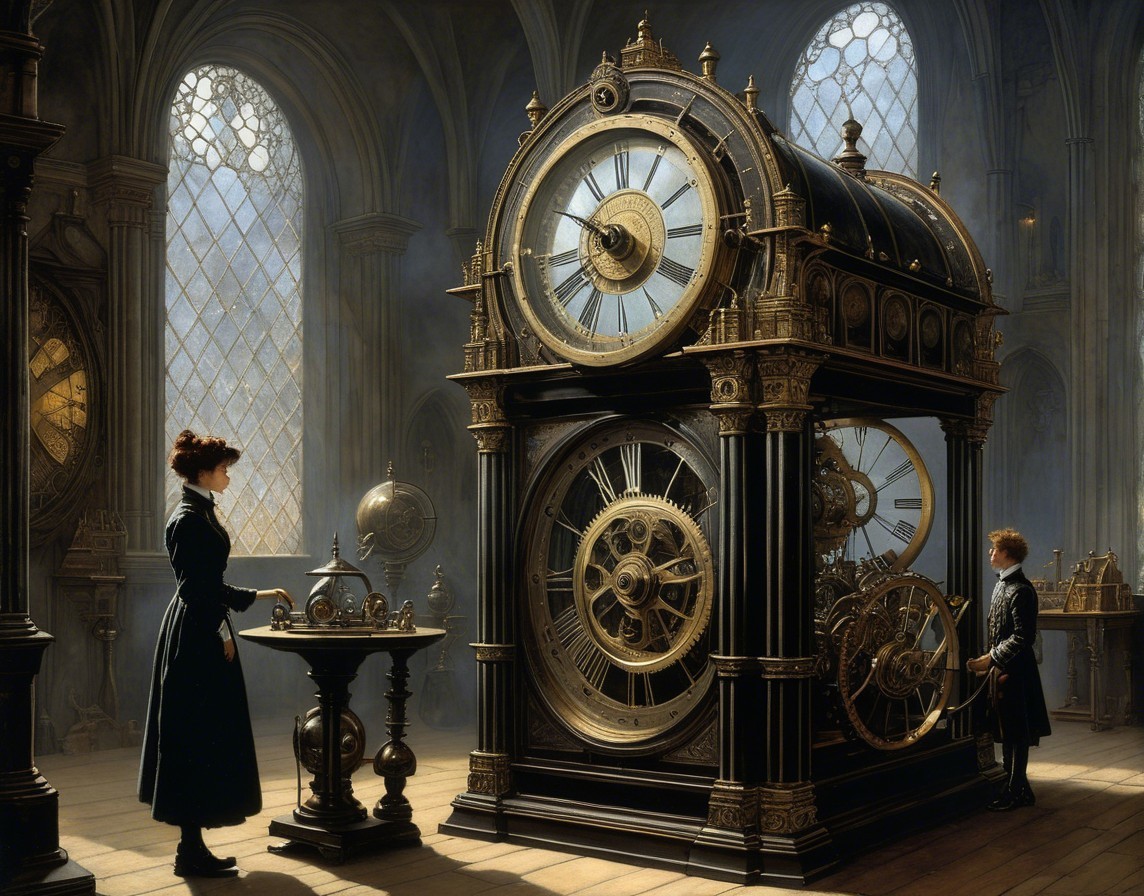 In a grand, dimly lit room, a magnificent antique clock stands tall, intricate in design, with golden accents and multiple dials. Two figures admire its craftsmanship, surrounded by artwork.