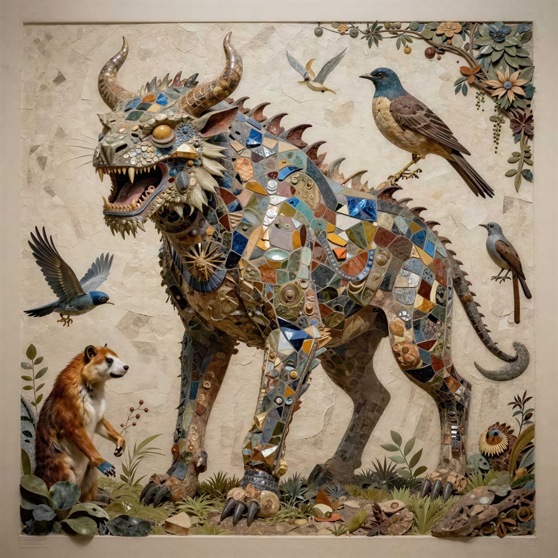 An artistic depiction of a large, mythical creature composed of colorful, varied tessellations stands in the center of a wide frame. The creature resembles a dragon or griffin, with horns, spikes on its back, a long tail, a horned head, and an open mouth revealing sharp teeth and a tongue