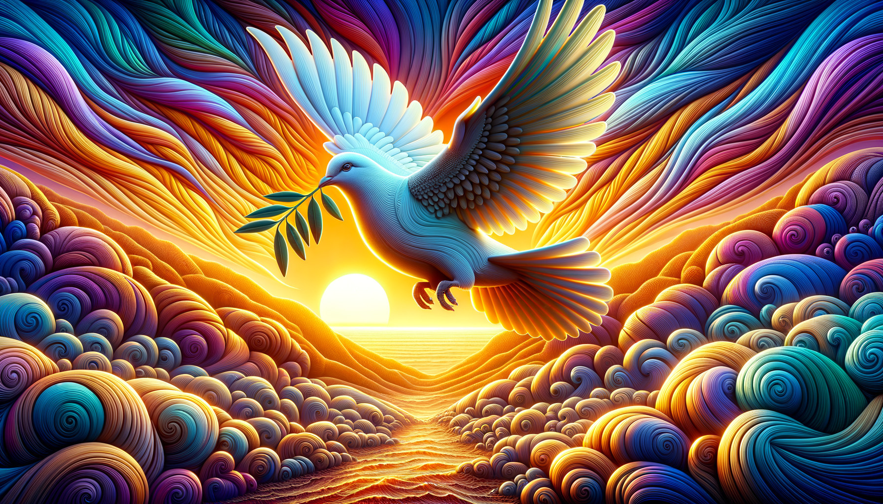 Colorful Sunset Scene: White Dove in Flight Over Water with Foliage Frame