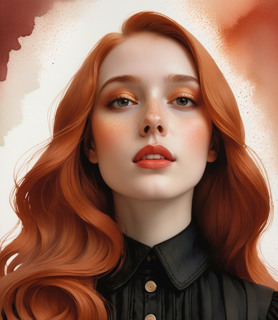 + Prompt:Storybook illustration by overton Loyd, hues by kate greenaway, american gothic 1.2, exaggerated features, tetradic color scheme beige red auburn ochre, stippled, upper body portrait of gorgeous red haired enchantress with devilish eyes, dyed, layered color spaces, parallax occlusion 1.2, colorful Flares and clouds, red and brown pastel, brightness 1.4, gothical dark fantasy, stylized watercolor drawing in saturated colors, high detail, textured,hatching, intricately detailed, hairstyle details 1.7, rim lighting, grunge, (brushstrokes (triadic color scheme red, ochre, burgundy) 6:11), background with gradient inking colors by Susan Seddon Boulet, 3 layers of dof, gouache details, (colorful background with tints in Bright illumination, intricate surrounding), tints of 1970s fantasy art) 7:11), plasticity 1.6, contouringoutlines,luminosity, 3d effects, tessellated, intricate strokes, spiritual essence, stylized flares, erotic essence, anisotropic filtering 1.7, soft rounded edges, plasticity 1.8, complexion 1.4,, brightness 1.3, ambient occlusion 1.5, dynamic lighting 1.7, colorful iridescence, raytraced shadows 1.8, radiance, divisionism, psychedelic psychpomp, natural decay, quilling, serene, ballsy, muscular, physically based, pale skin, synthetic, occult, 3 layers of dof, foampunk, sweaty, crisp quality, octane render illustration 1.5, tints of pulp art 1.7, grunge, uhd hdr, harsh lighting from top to centre, dreamscape, foampunk 1.9, concept art, overall composition by Earl lMoran, high stylization in folded paper style, warm colors. Hefty Shades of :Palatinate, French Mauve, Rose Red, kale, intricate pastel patchwork, punk-rock by catherine abel, Dee Nickerson and Dejah Thoris, octane render illustration 1.5,64K,wavery textures, thickened brushstroke fields, reminiscent of FrankMcCarthy