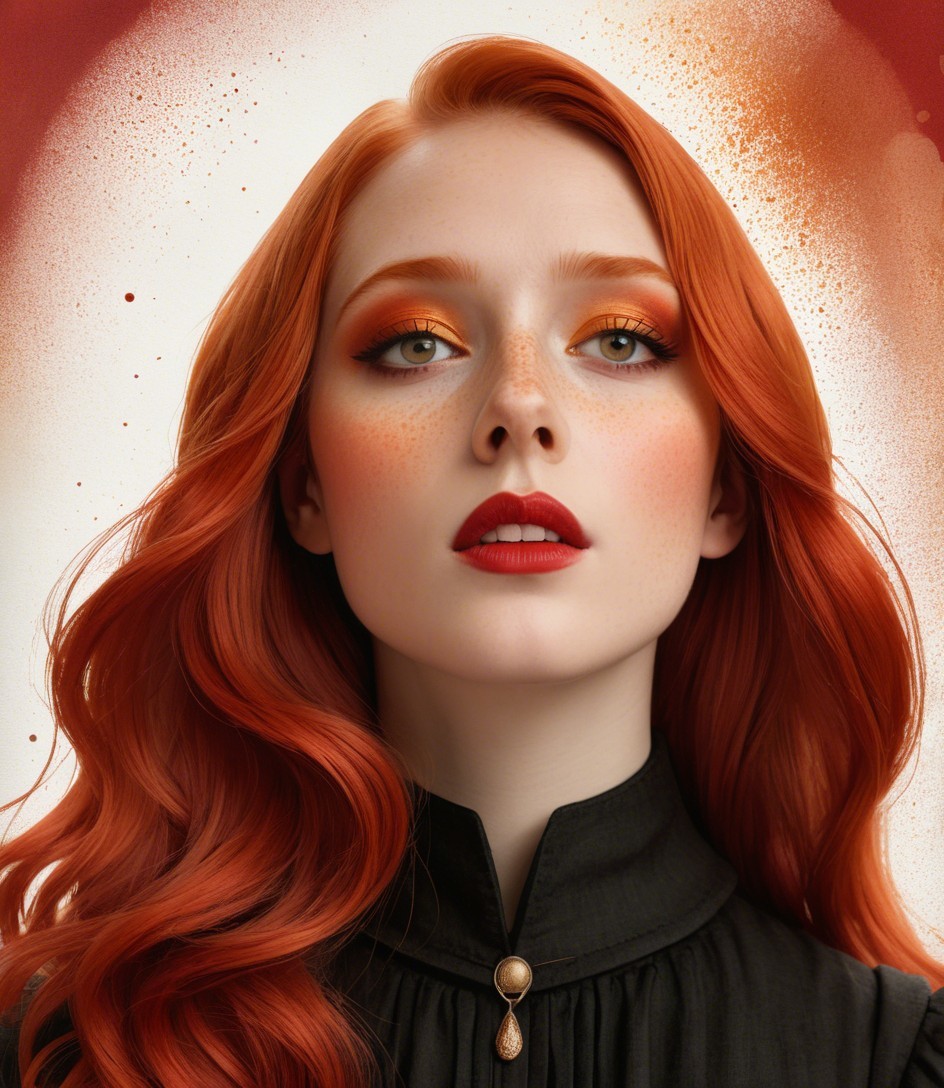 The image features a young woman with flowing, vibrant red hair and radiant makeup, including warm orange tones and a bold lip, set against a soft, watercolor