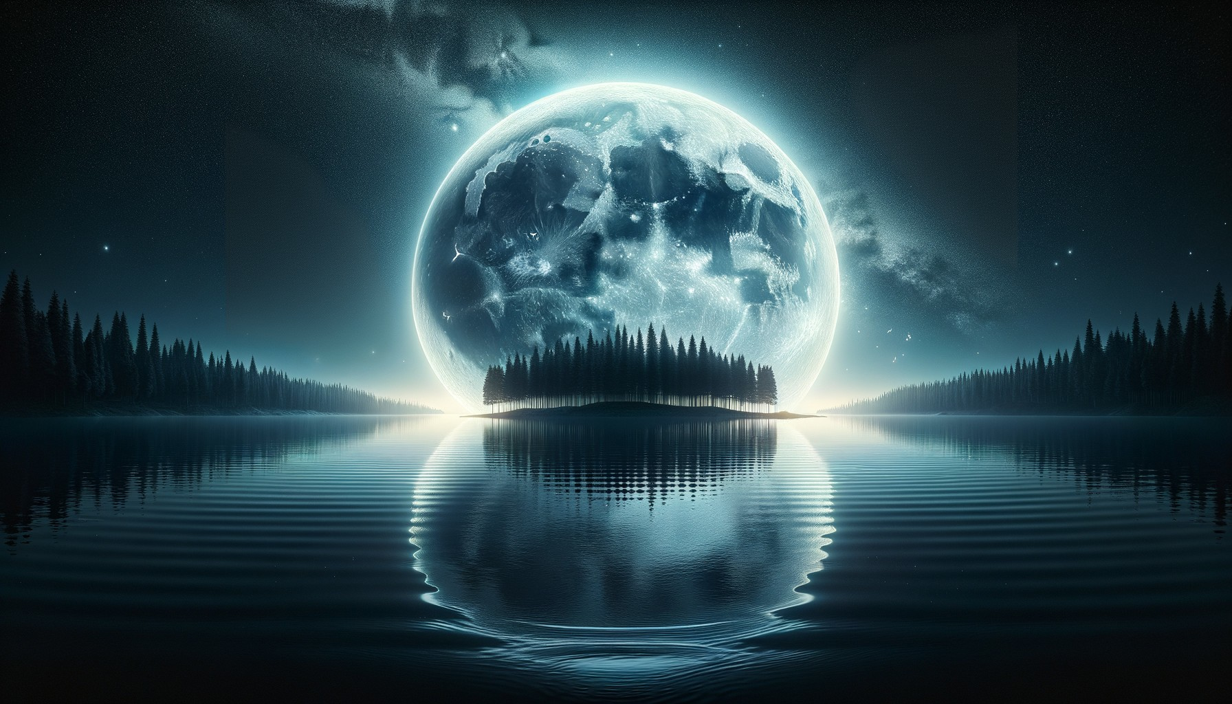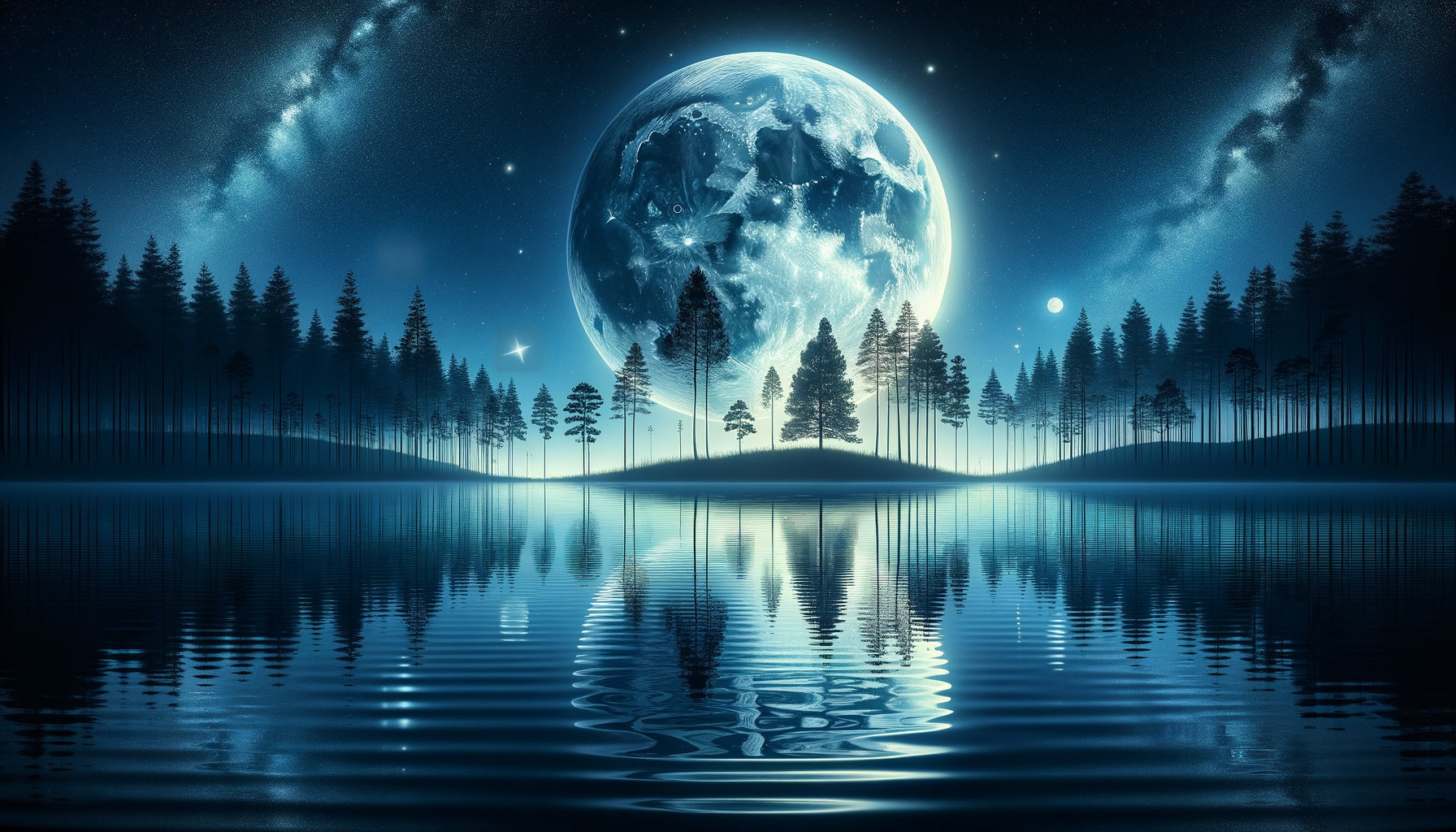 A serene night scene with a full moon reflected on a calm lake surrounded by silhouetted pine trees under a starry sky.