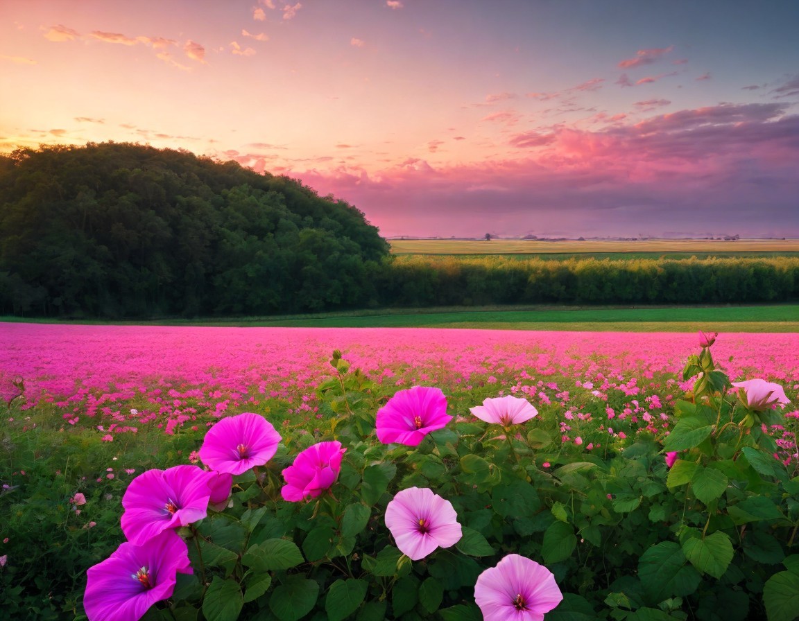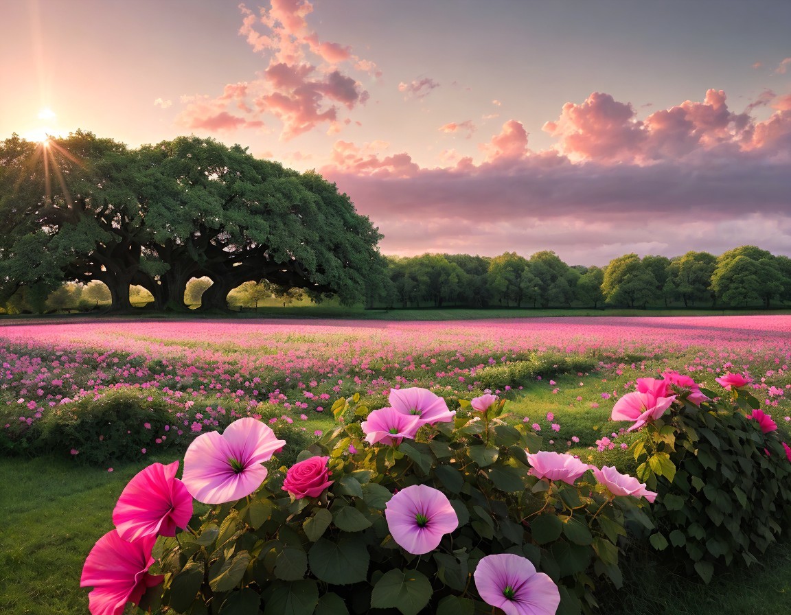 A serene landscape featuring a vast field of pink flowers under a colorful sunset. A majestic tree stands in the background, enhancing the peaceful, picturesque scene.