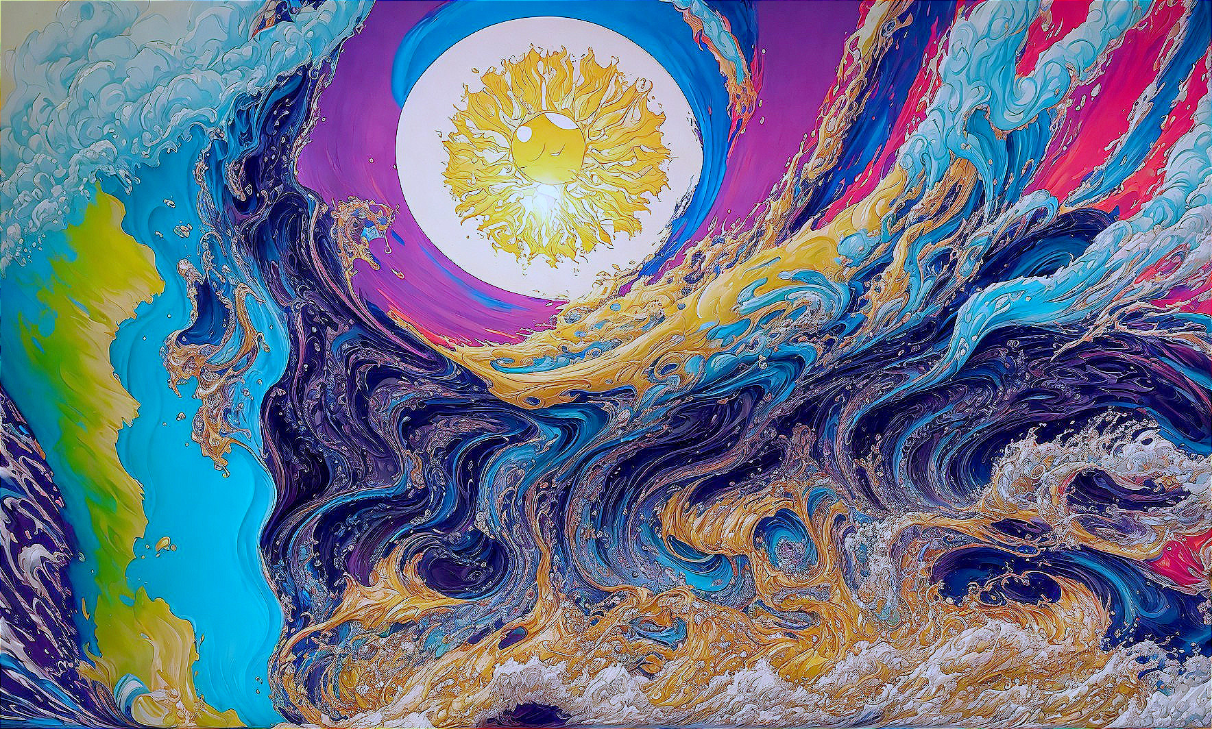 + Prompt:Surrealism. the sun and waves and the turquoise blue lake, the street already under water.Surreal swirling white clouds float around. 1 point perspective. Mysterious, intricate motifs, perfect composition, masterpiece insanely-detailed ultra-detailed extreme-detailed hyper-detailed beautiful, graffiti art, splash art, street art, spray paint, oil gouache melting, acrylic, high contrast, colourful polychromatic, ultra detailed, ultra quality, CGSociety.