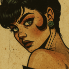 A stunning, stylized portrait reminiscent of classic mid-century pin-up and comic book art. The subject features dark, elegantly styled hair, striking green eyes, and perfectly applied makeup with bold pink eyeshadow and coral lips. The clean lines and glamorous aesthetic create a timeless look of confident sophistication.