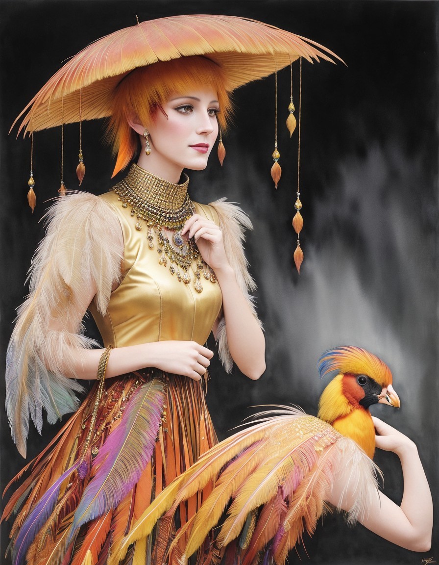 An elegant woman in a gold dress adorned with feathers, wearing a wide-brimmed hat, poses beside a colorful bird.