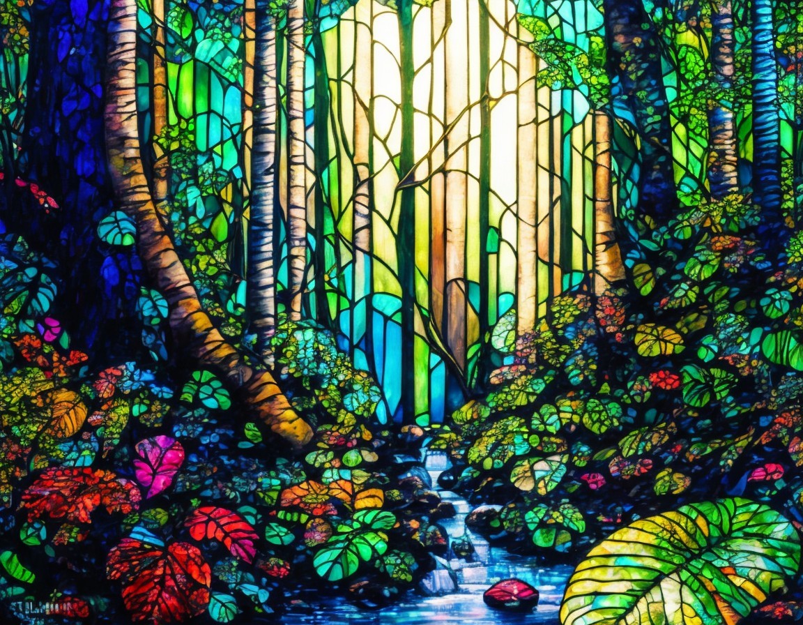 Vivid stained glass masterpiece, Tiffany-inspired, dense rainforest scenery, towering trees, intricate branches, sunlight filtering through leaves, ethereal glow, whimsical and magical jungle, detailed foliage, rich textures, satin-like finish, shimmering reflections, high-quality 3D rendering, captivating and immersive, saturated colors, Alphonse Mucha style elements, enchanting and dreamy ambiance.