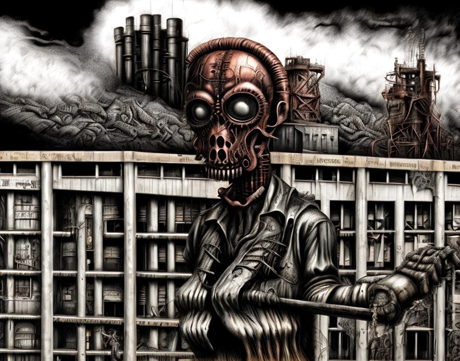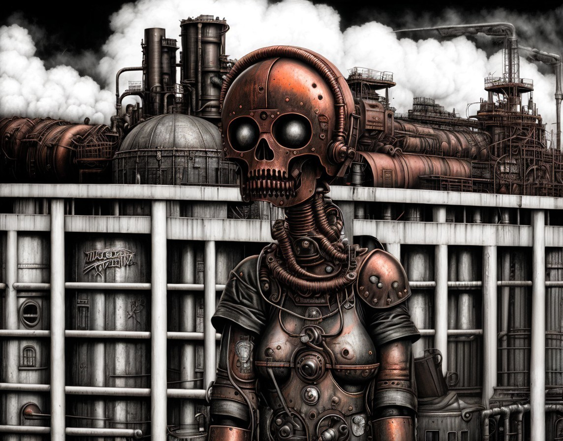 Skeletal Robot in Steampunk Industrial Setting