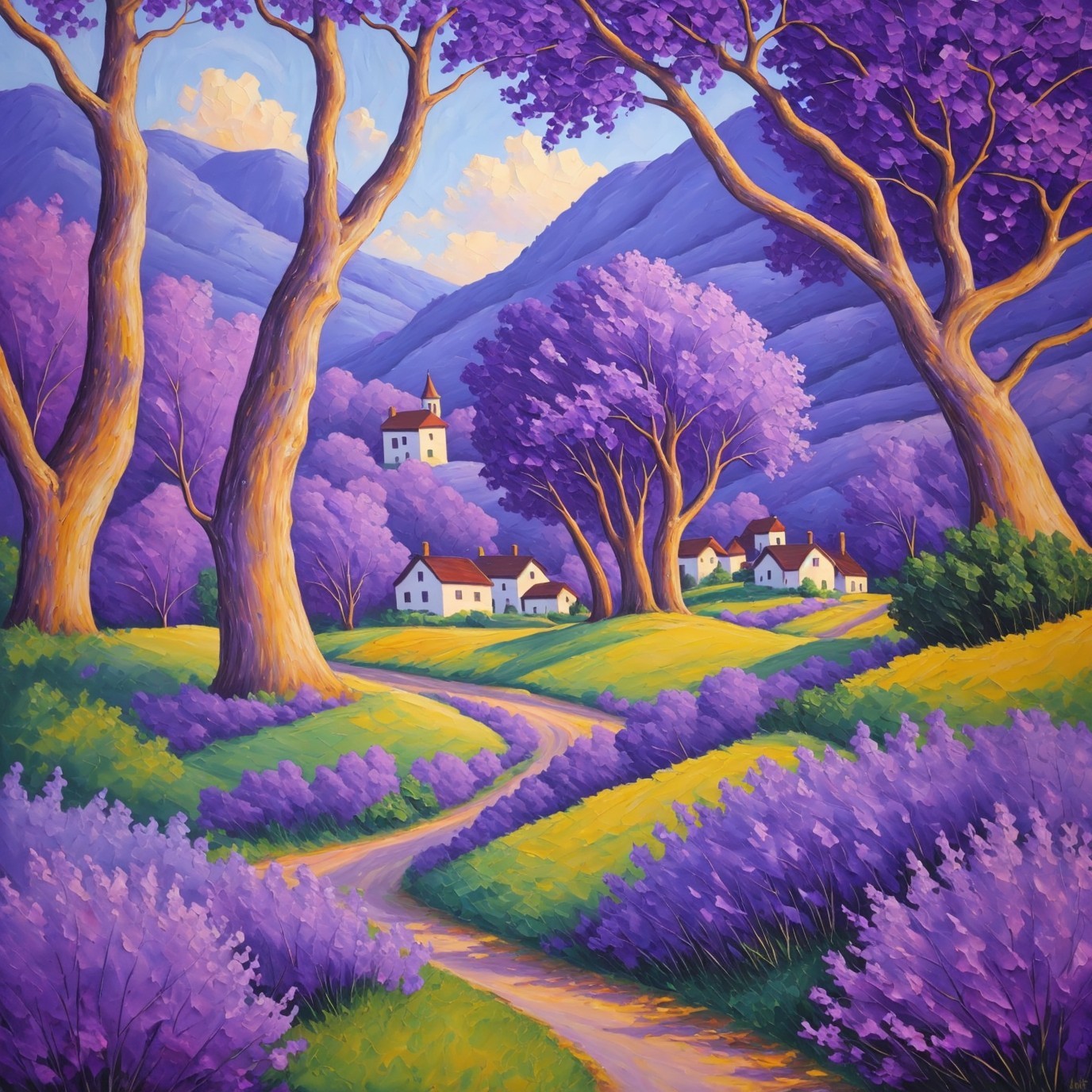 A vibrant painting of a rural landscape with purple trees, a winding path, lavender fields, and quaint houses against a backdrop of mountains.
