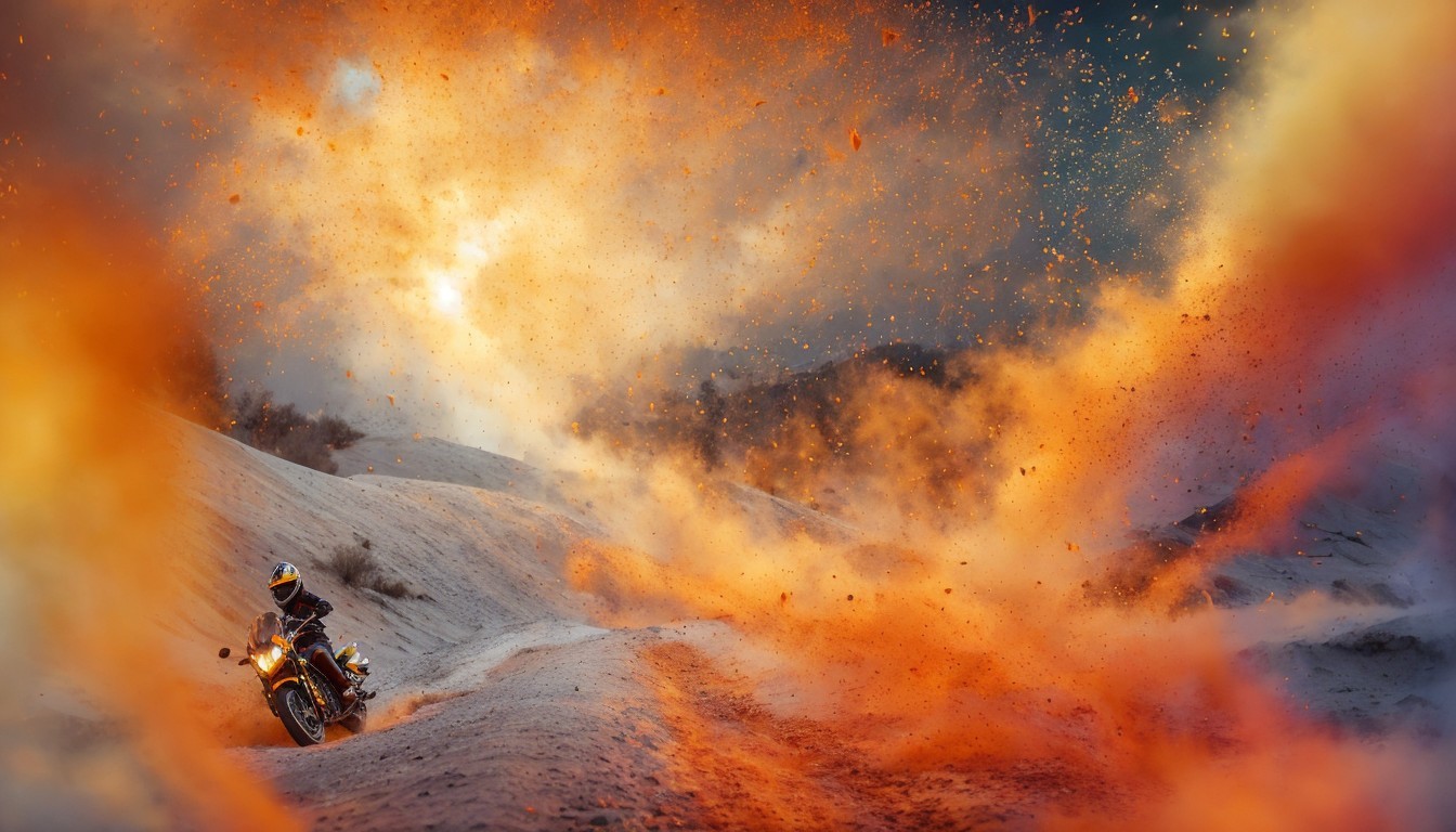 A motorcyclist rides through a dramatic, dusty landscape under a cosmic sky with stars peeking through the clouds of dust.