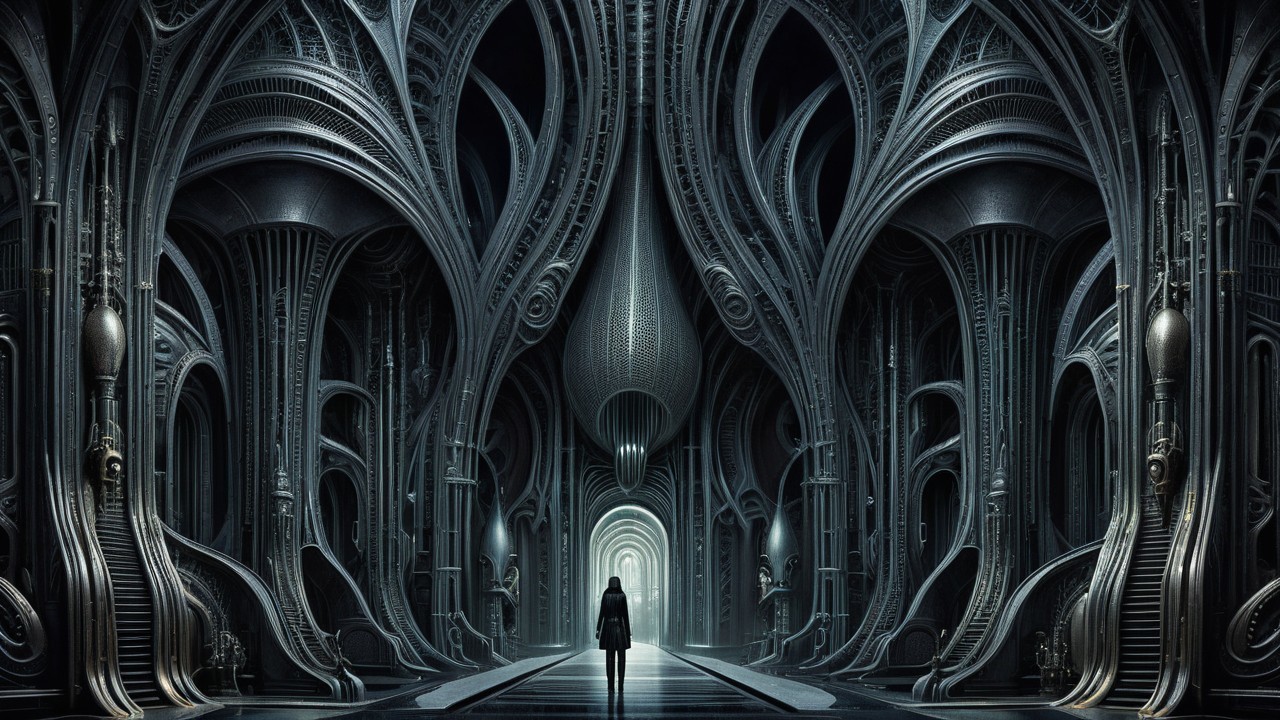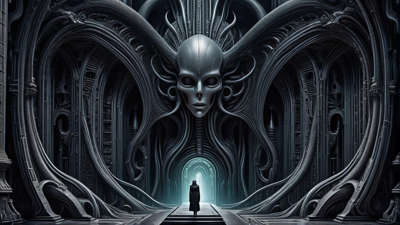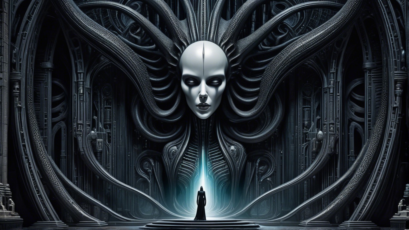 A dark, futuristic scene features a towering, intricate structure with a humanoid face surrounded by tendrils. A solitary figure stands before it, illuminated by a mysterious blue light.