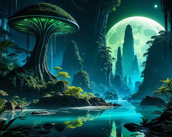 A lush, mystical landscape features towering, mushroom-like structures covered in vibrant green moss and surrounded by dense vegetation, illuminated by soft rays of sunlight filtering through the trees.