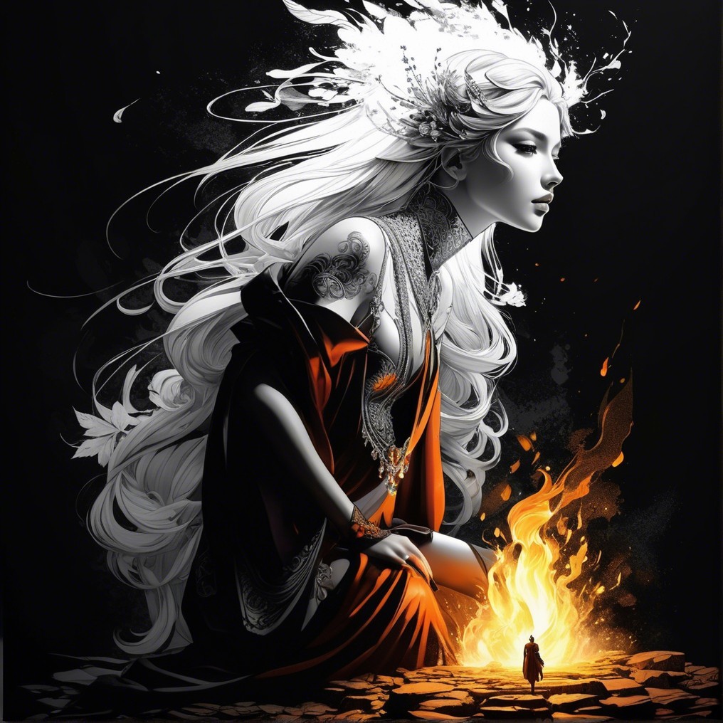 A mystical figure with flowing white hair and intricate silver adornments gazes thoughtfully. Below, a small silhouette stands before a flickering flame, evoking a sense of wonder and magic.