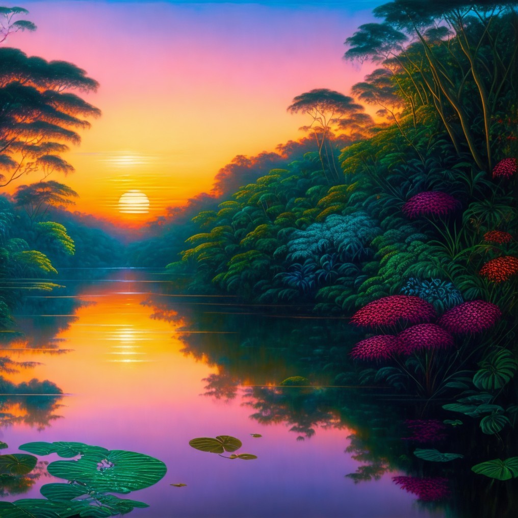 Prompt: FULL PAGE image, NO SPLIT IMAGE, 3d oil, sunset by William Turner, brightly colored tropical flowers, delicate ferns and vines, lacy teal-colored plants, dense Rainforest jungle, reflections in winding river, intricate, satiny, high quality, shimmering, vibrant colors, with elements in the style of Gustav Klimt and subtle Tingatinga style elements
