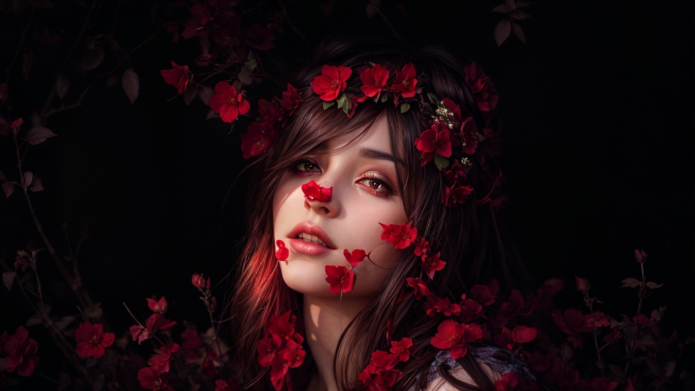 A serene portrait of a young woman framed by vibrant red flowers, her expressive eyes and delicate features radiate beauty and tranquility against a dark background.