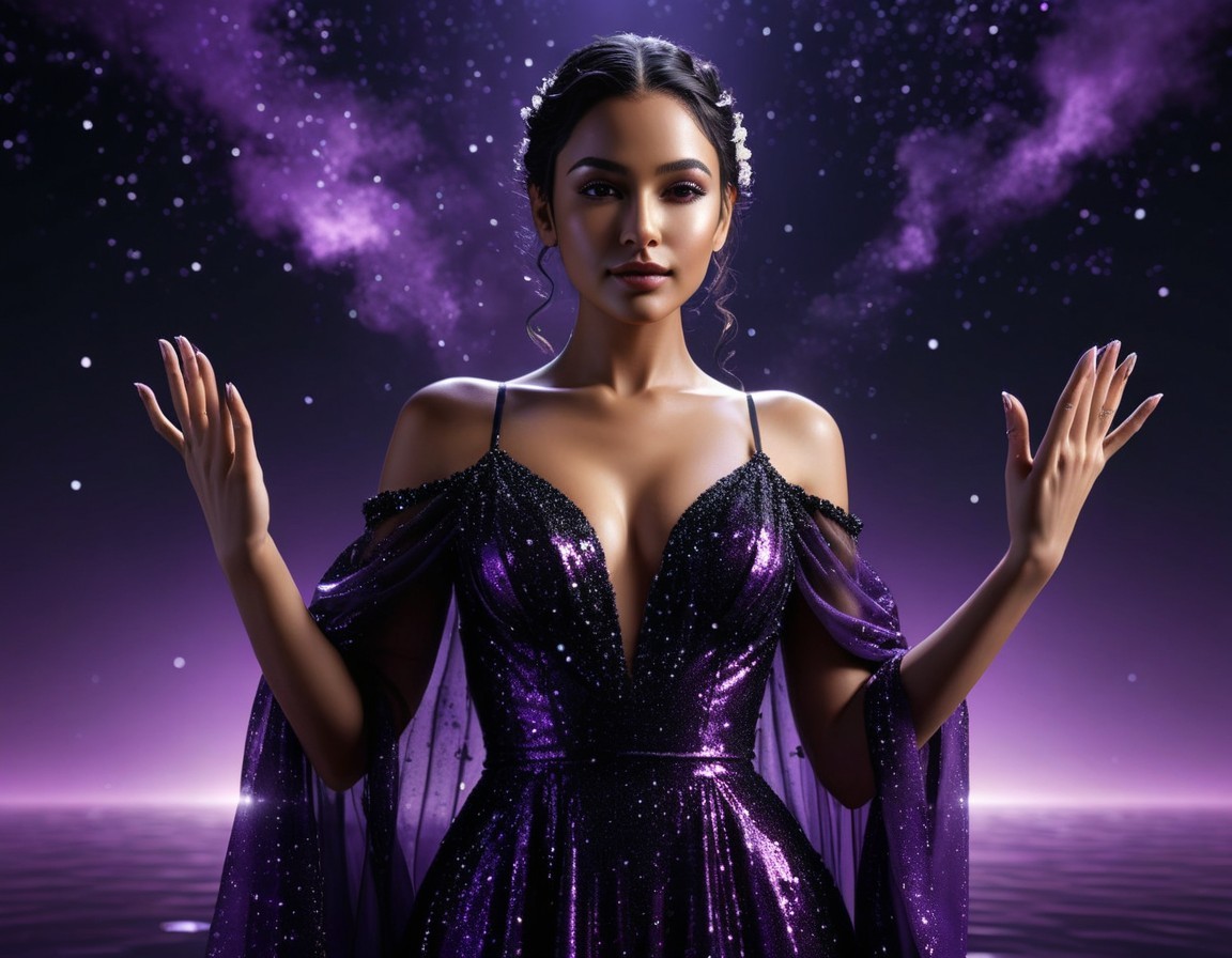 A striking figure draped in a shimmering purple gown, exuding elegance. With hands raised, she stands against a mystical backdrop of swirling smoke, creating an enchanting atmosphere.
