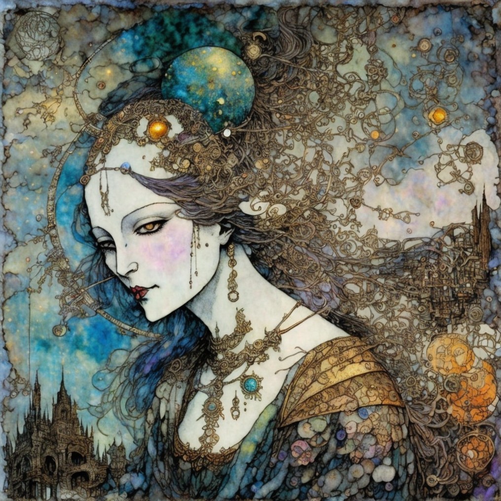 A stunning illustration of a woman with intricate hair and jewelry, set against a background of swirling blues and metallic patterns, merging elegance with a steampunk aesthetic.