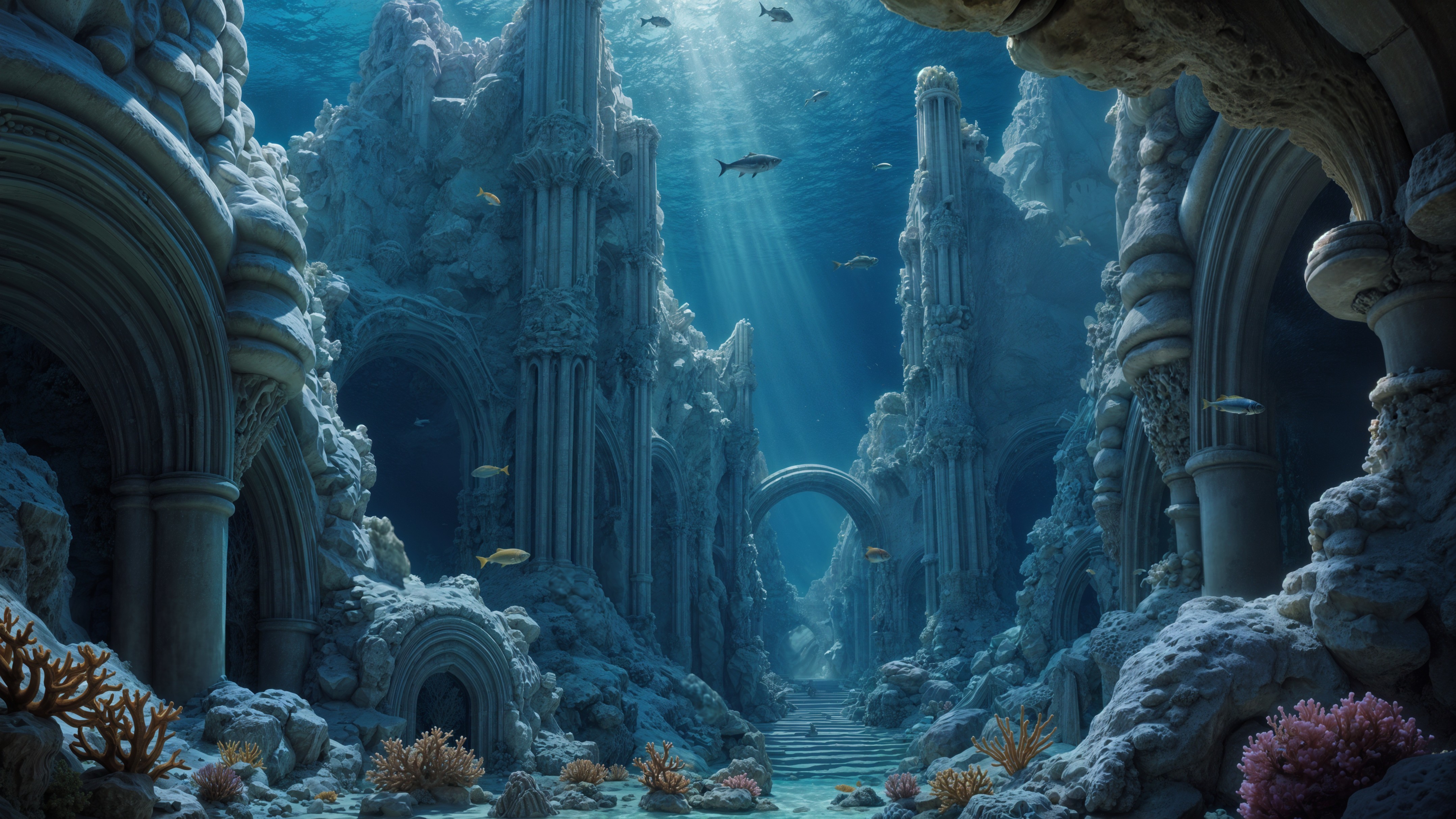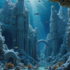 An underwater scene depicts the ruins of a sprawling classical-style city, with towering columns, intricate archways, and a grand staircase leading into the distance. The structures are overgrown with various types of coral and marine vegetation, including textured tan corals and vibrant pink coral clusters. Schools of gray and yellow fish