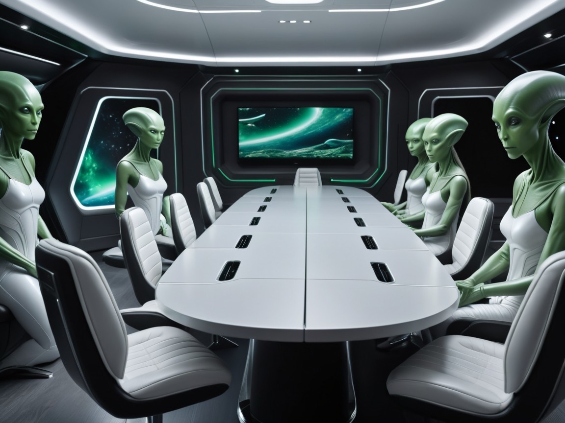 A futuristic dining room featuring humanoid aliens with green heads and white attire, gathered around a sleek round table set with elegant dinnerware, creating an otherworldly ambiance.