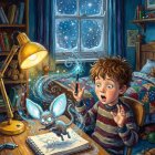A young boy with reddish-brown messy hair and freckles on his face, wearing a striped sweater, sitting at a wooden desk in a dimly lit room. The boy is looking wide-eyed and shocked at a small, fluffy creature with large glowing blue eyes and long, light-blue rabbit-
