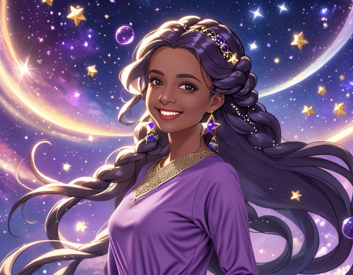 Prompt: Asha from the movie Wish is surrounded by glittering stars and bubbles, smiling, long braids in her hair, sparkles, glittering purple tunic. Cartoon In the style of Don Bluth, Emily Balivet.