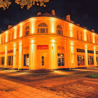 A beautifully illuminated historic building stands at night, showcasing ornate architecture. The warm glow from its windows contrasts with the wet pavement, creating a captivating urban scene.