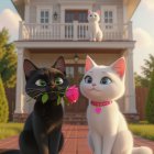A cute black cat holds a rose in its mouth while sitting beside an adorable white cat. In the background, a playful dog watches from a charming house with a porch.
