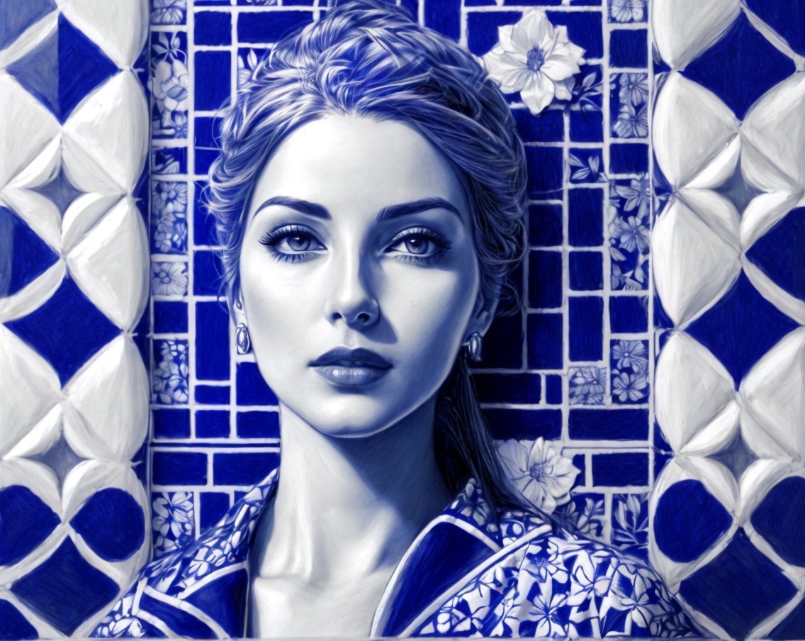 The image features a striking portrait of a young woman against a backdrop of intricate blue and white patterns, highlighting her serene expression and elegant style.
