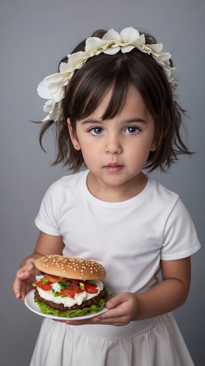 A young child, presumably a girl due to the presence of flower wreath, with dark brown hair, blue eyes, and light skin, faces the camera. She is wearing a white floral wreath headband, a white t-shirt, and a white skirt.