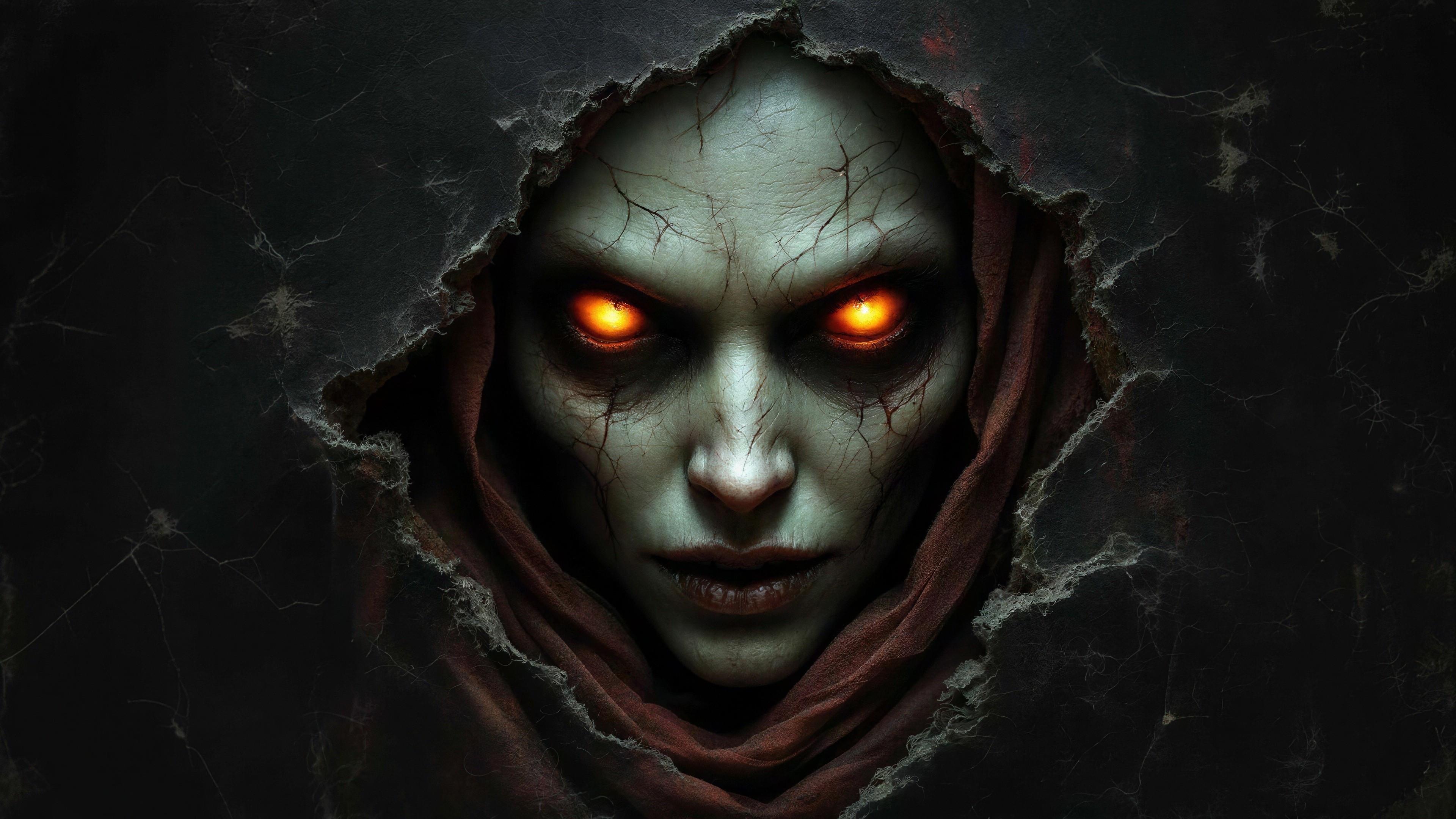 A creepy face with orange glowing eyes and cracked, pale skin emerges from a ripped piece of dark fabric, possibly a blanket or a drape, with a dark red hood framing the face and dark red fabric wrapping around the neck, with detailed wrinkles, veins, and fine hairs woven into the tattered fabric