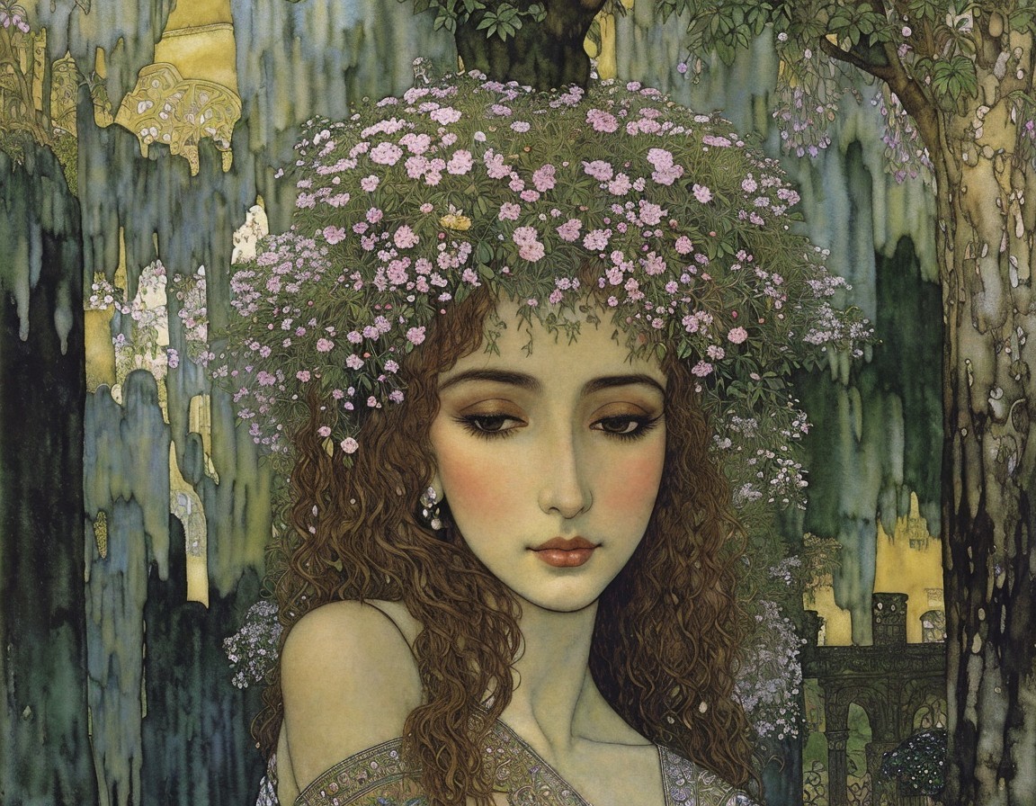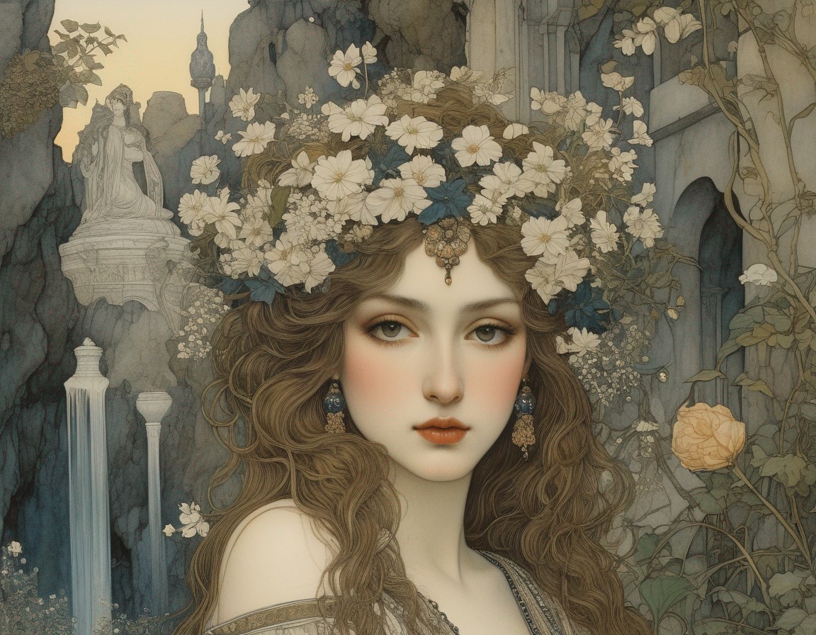 An illustration of a woman with a floral crown and detailed features, set against a backdrop of an ancient city and lush vines.