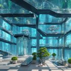 A futuristic atrium with multiple levels, featuring sleek glass walls and vibrant greenery. Clear blue water flows through the space, creating a serene, nature-infused environment.