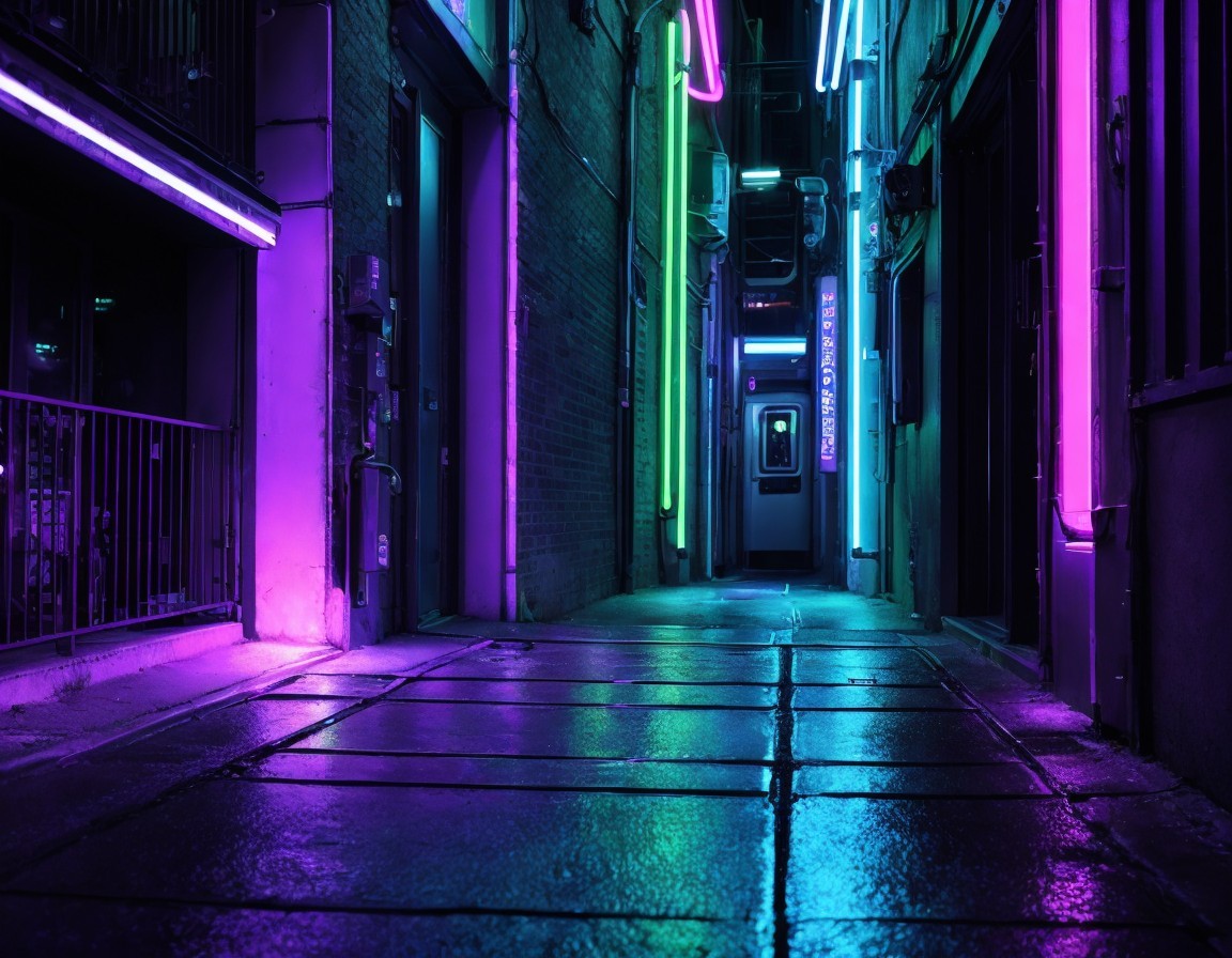 A vibrant, neon-lit alleyway features glowing purple and green lights reflecting on wet pavement, creating a moody, futuristic atmosphere. The scene evokes a sense of mystery and adventure.
