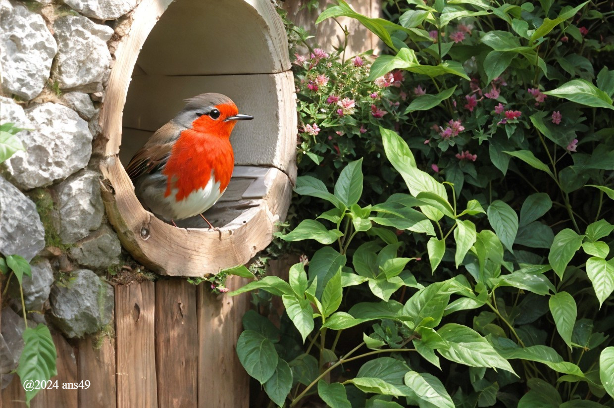 A robin perched at the entrance of a wooden birdhouse surrounded by lush green leaves and pink flowers.