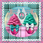 A whimsical glass globe captures a serene winter scene with pink and green trees, shimmering snow, and a reflective surface, all set against a sparkling background.