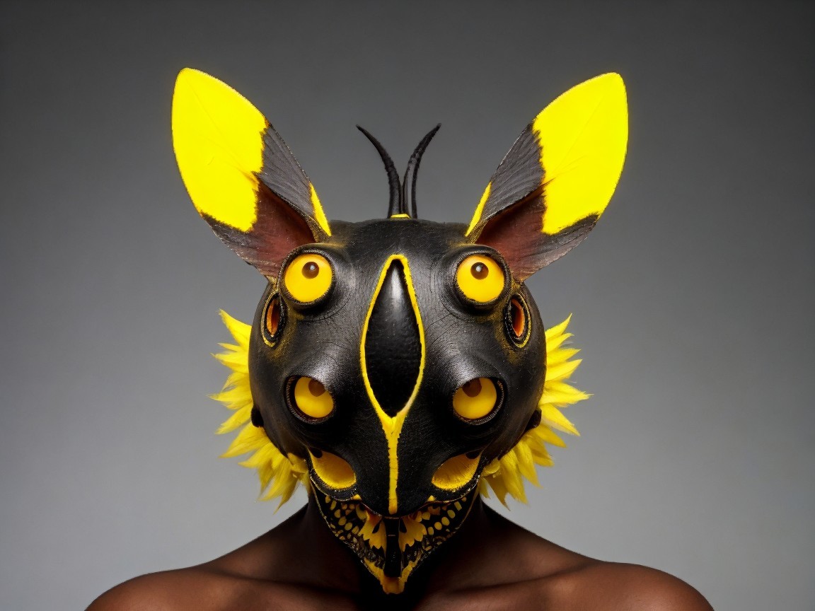 Close-up studio shot of a dark-skinned person wearing a black and bright yellow horror gothic-style animal mask, reminiscent of an insect or a fantastical creature, with large yellow ears, black antennae, multiple round yellow eyes protruding from the mask, a prominent vertical yellow stripe down the center of the
