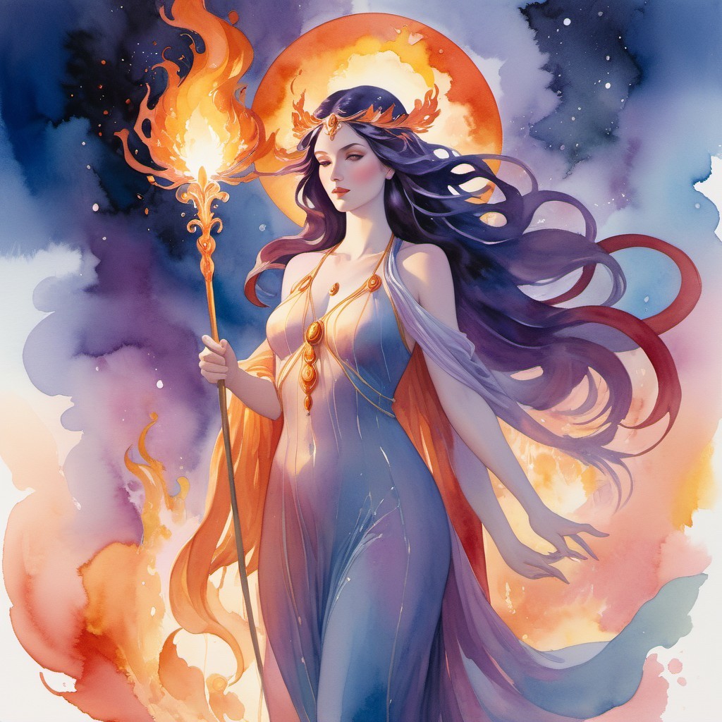 Prompt: The painting depicts a dreamy watercolor scene with a wet-on-wet technique, using minimal colors and soft, fluid strokes to create a hazy, impressionistic composition. Promethea, the Goddess of Magic, stands tall and regal, radiating divine power and mystical energy. In her left hand, she grips a flaming staff, its fiery tendrils spiraling upward and casting an ethereal light that dances around her. Ancient runes glow faintly at the staff’s base, harmonizing with the flames.