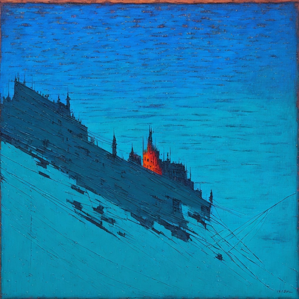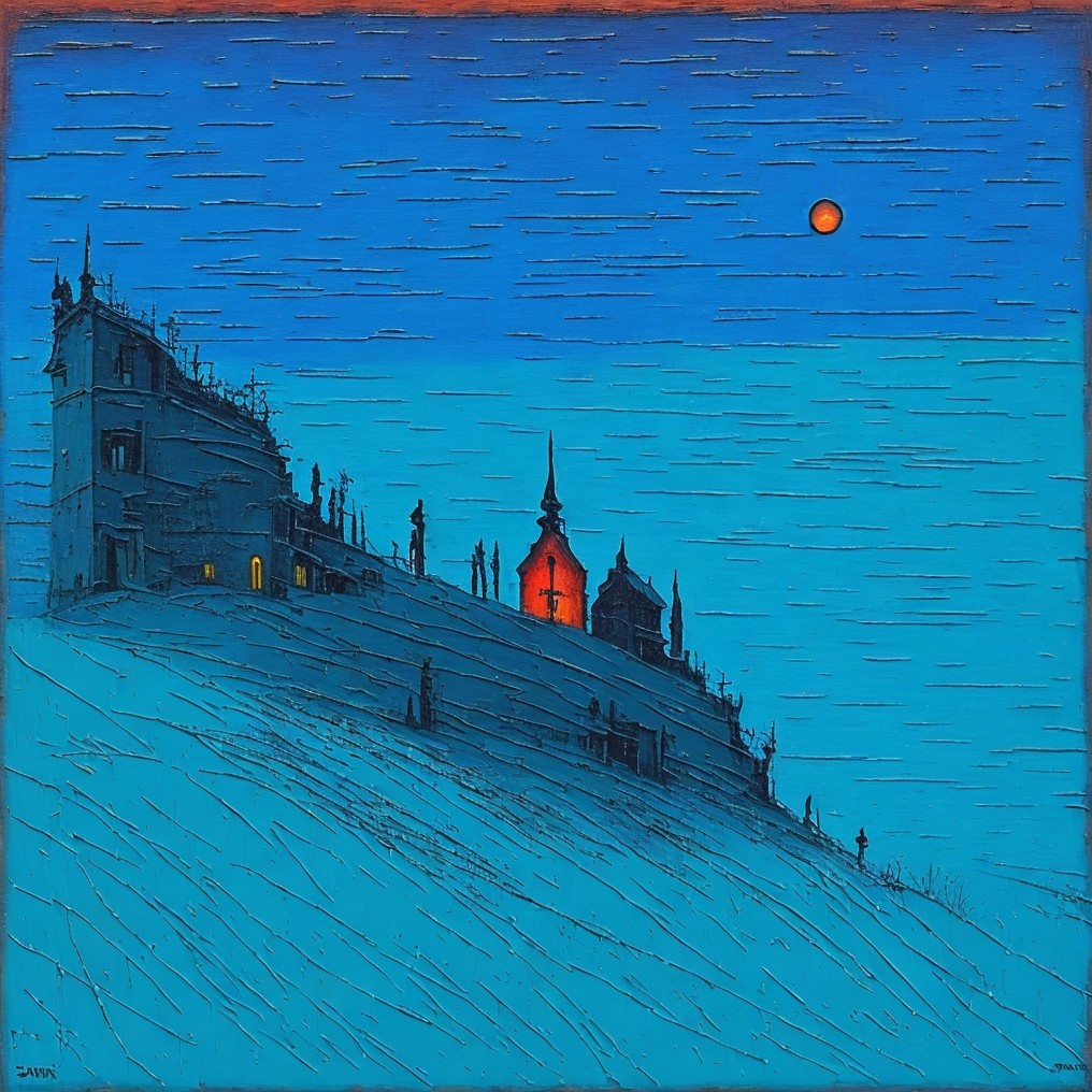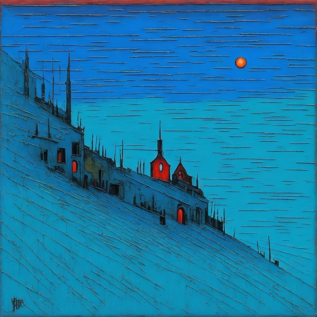 A cloaked figure climbs a tilted landscape soaked in mood and texture. The distant red-roofed keep glows under a washed, streaked sky. Forms bend into one another like fading thoughts. The piece breathes nostalgia, silence, and the strange weight of waking memories.