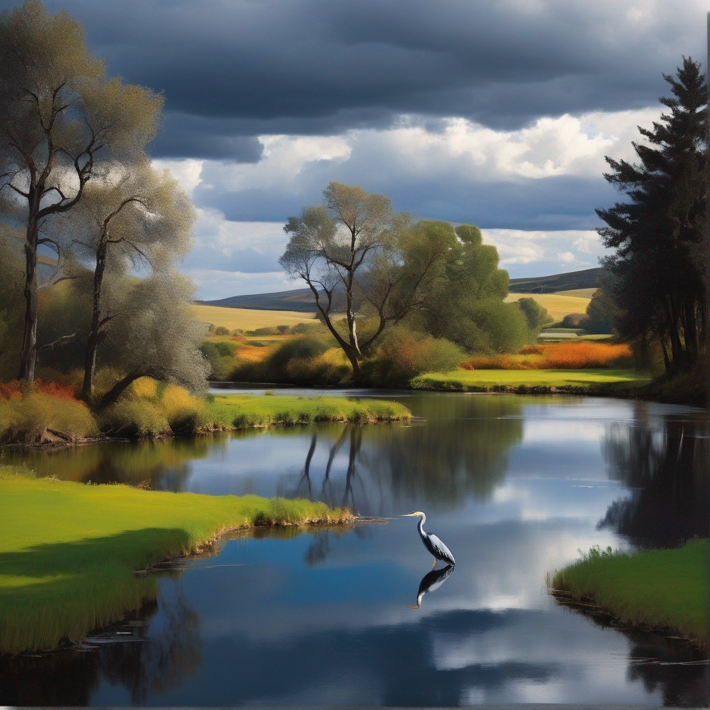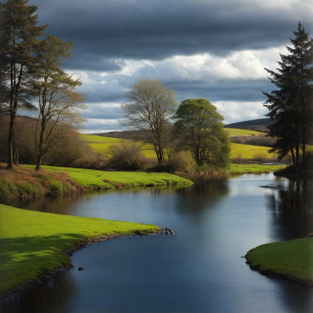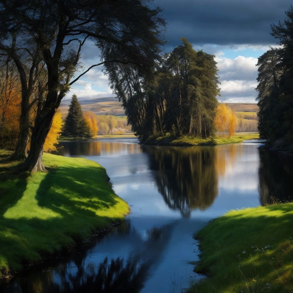 A serene river landscape with verdant trees, lush grass, and a cloudy blue sky reflecting on the water's surface amidst rolling hills.