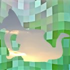 The image features a surreal landscape with floating green cubes amidst a dramatic sky. Soft sunlight filters through clouds, creating an ethereal ambiance that evokes a sense of wonder.
