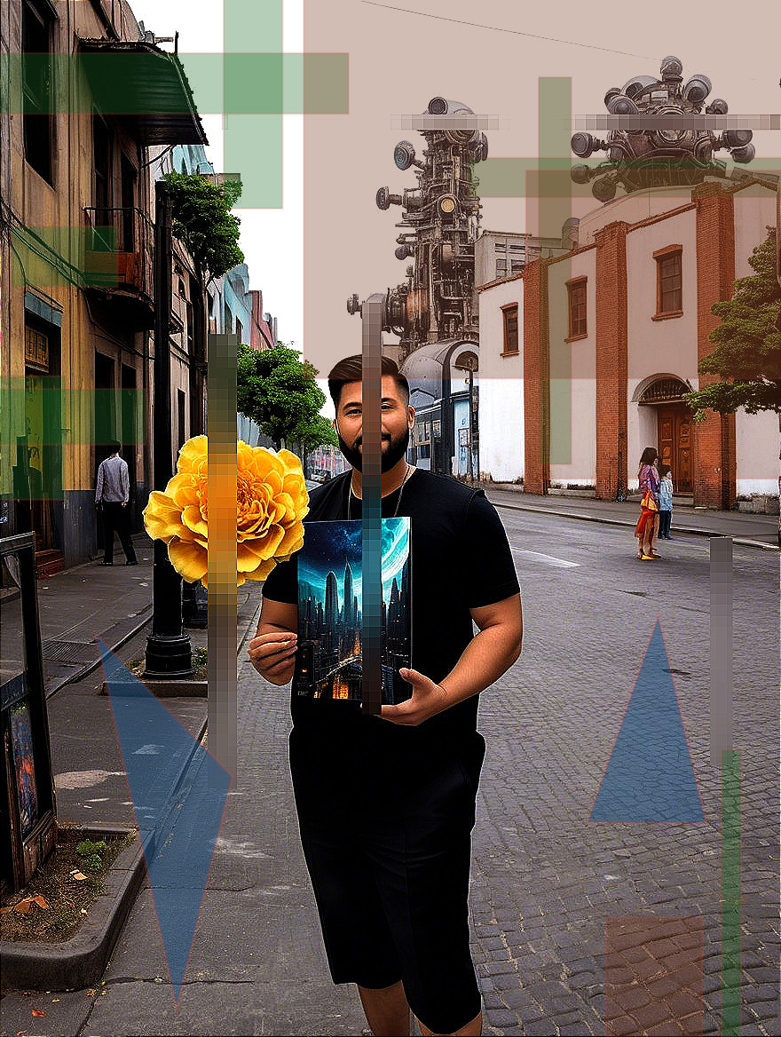 A figure in a sleek suit stands before a futuristic city, gazing at towering structures and portals. Spaceships dart through the sky as vibrant clouds hover above a stunning skyline.