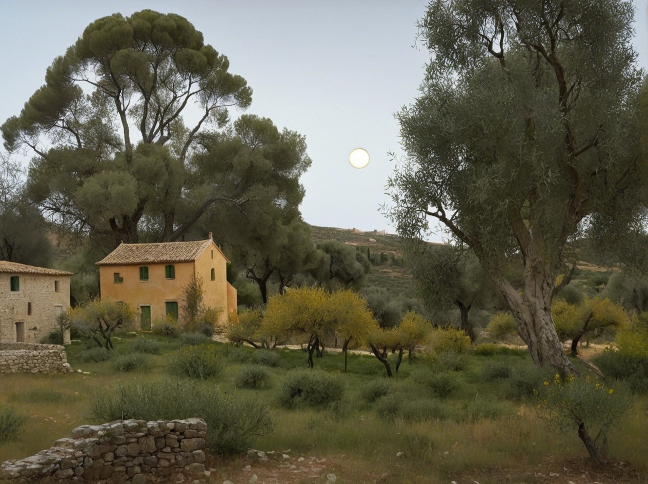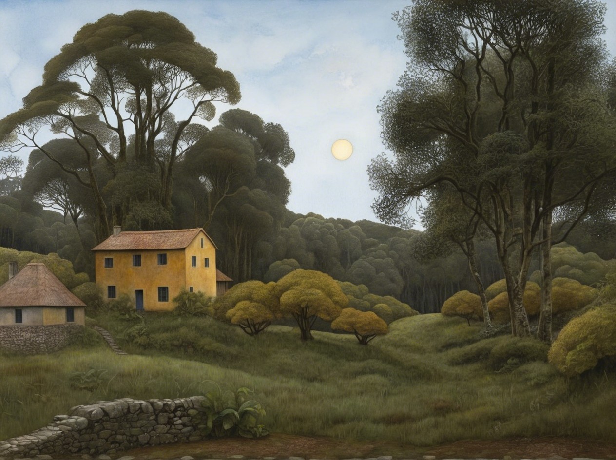 A serene landscape features rolling hills and dense trees under a soft sky. A quaint yellow house sits amidst vineyards, with a warm sun rising softly in the background, creating a tranquil scene.