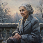 An elegant, gray-haired elderly lady on the terrace, winter snapshot..