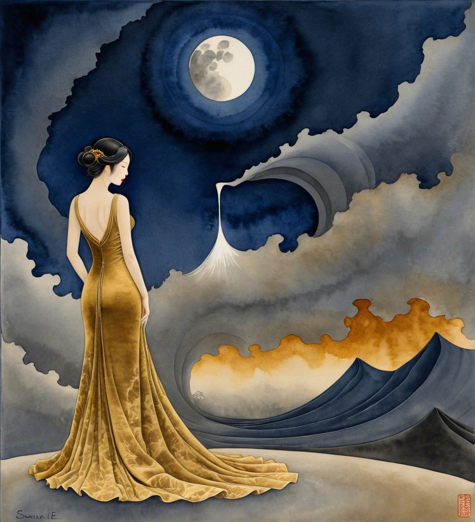 + Prompt:I am a drop of water that is part of a wave. I am the flow of momentum and I adapt to my role. I love being unique but I am aware that I am part of a whole., Medieval Japanese Artists Sumi-e Style, Velvet Black, Velvet Indigo, Shabby, Dull Gold, Amber Gray, Golden Ratio, Surreal Fantasy, Elegant, High Definition Ultra Fine 3D Line, Zenangle Style, Watercolor Patchwork , Arthur Rackham Style, Paul Kidby, Gediminas Prankevicius, Jacek Jerka, Extremely Detailed, Intricate, Thoughtful, HDR, Fractal, Beautiful, Award Winning, Fantasy Look, Fantasy, Crisp Quality