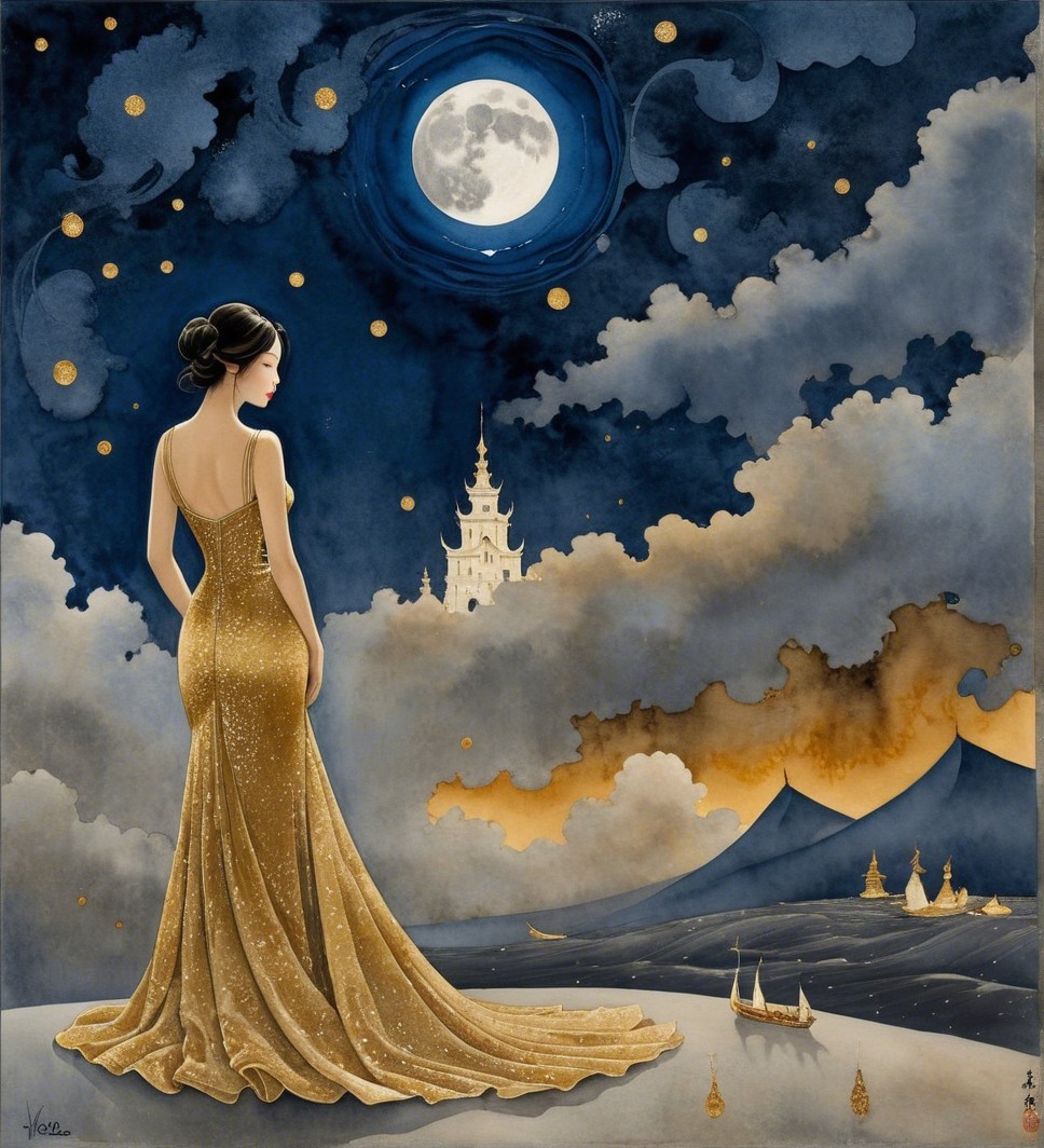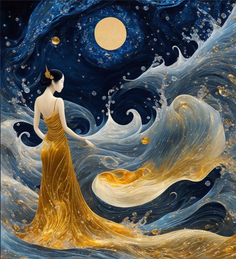 A graceful woman in a flowing golden gown stands by the ocean, her back to the viewer. Vibrant waves crash around her under a luminous moon, creating a serene, enchanting atmosphere.