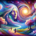 A vibrant fantasy scene features a couple walking along a winding path, surrounded by colorful trees and celestial elements, including a dreamy face and swirling planets in a cosmic sky.