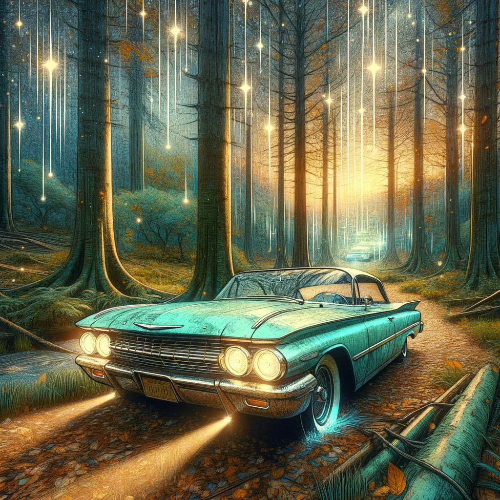 Vintage car in an enchanted forest with ethereal lights and a mystical ambience.