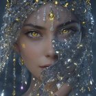 A mesmerizing close-up of a character with striking golden eyes, adorned in an intricate golden mask with sparkling jewels. Ethereal lighting enhances the magical, fantasy-like atmosphere.