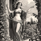 A classical figure, adorned with a crown of leaves, stands in an arched doorway. Surrounded by foliage and animals, she embodies nature, with a serene landscape in the background.